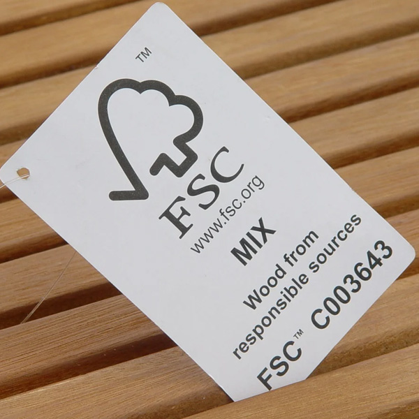 Forest Stewardship Council certified hangtags made from responsibly sourced paper materials.